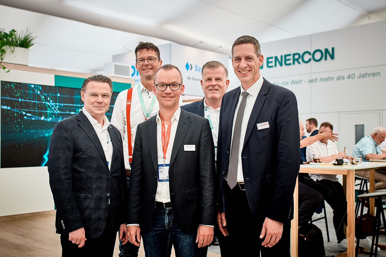 Bildunterschrift: Gemeinsam hoch hinaus für die Energiewende (v. l.: Udo Bauer, CEO Enercon, Thorsten Betz (Leiter Engineering Max Bögl Wind AG, Stefan Braun, kaufmännischer Leiter Max Bögl Wind AG, Jörg Schol-le, CTO Enercon, Stefan Bögl, Vorstandsvorsitzender Firmengruppe Max Bögl)