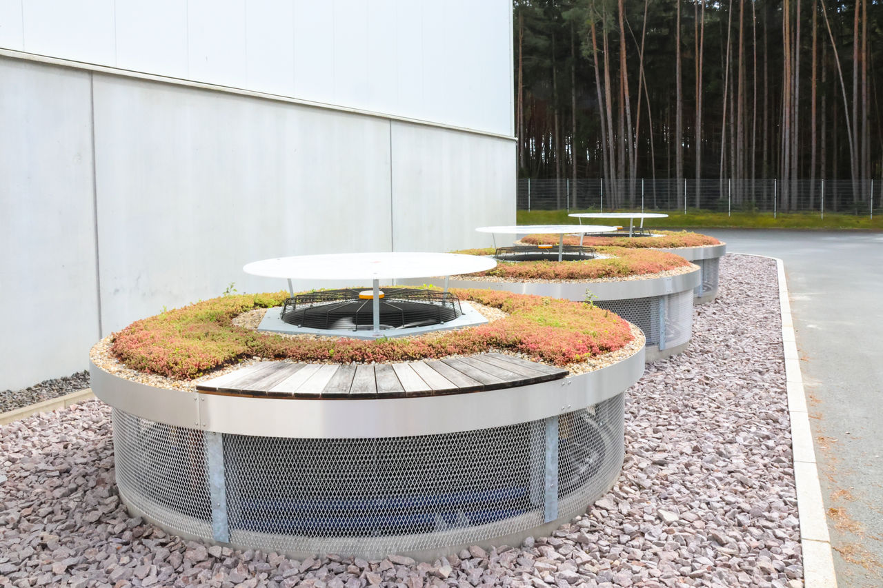 A storage module consists of a three-meter deep, non-insulated concrete basin to allow energy to be exchanged between the ground and the ice store. Inside the basin are long pipes in which a frost-proof brine consisting of a water-glycol mixture circulates. The air module with the large air heat exchangers is located in the upper third of the basin. The whisper fan located in the middle of the surface guides the fresh ambient air through the air heat exchanger. Thanks to its modern, customized design, the air-ice storage can be placed next to buildings for visual enhancement or as a purely functional unit behind them.
