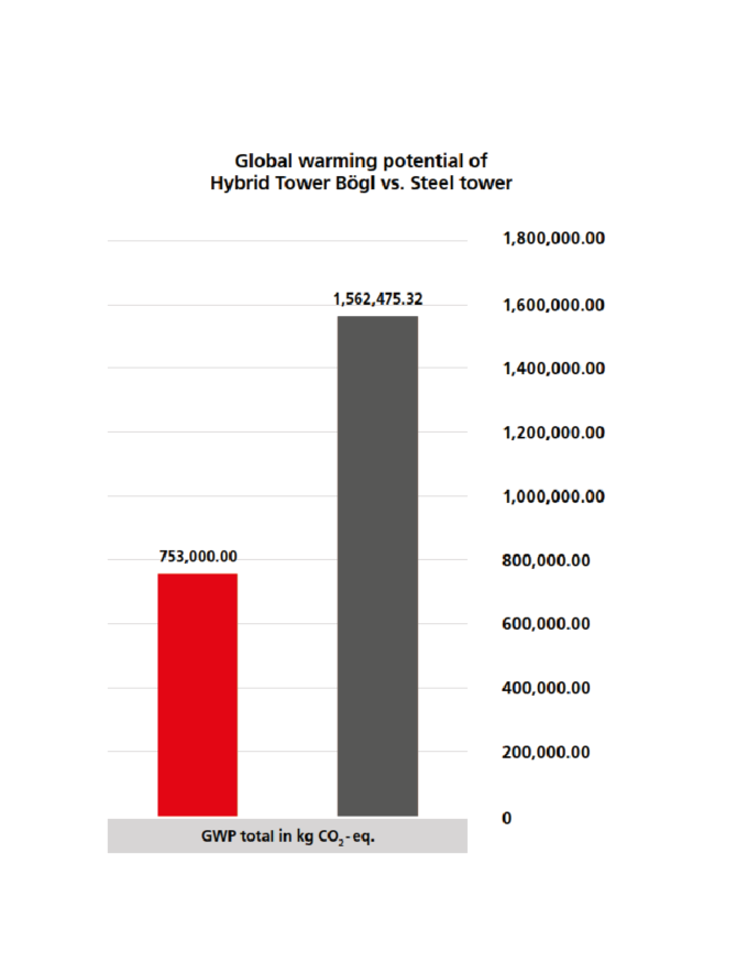 The life cycle assessment of the Hybrid Tower Bögl showed that a steel tower of comparable height causes up to 50% more CO2 equivalents over its life cycle – even though the hybrid tower consists largely of concrete elements. By using environmentally friendly concrete, in which up to 60% of the cement content in the concrete mix is substituted, up to 50% in CO2 equivalents could be saved.